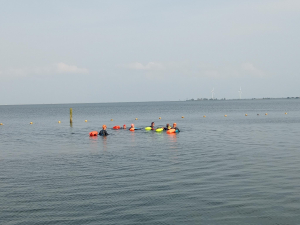 In de warmere maanden van het jaar verzamelen zich elke maandagavond rond zes uur een groepje enthousiastelingen op het strandje bij het Mirror Paviljoen in het Hemmeland om te gaan zwemmen in de Gouwzee. Een prima gelegenheid om eens te kijken hoe dat nou voelt, zwemmen in het buitenwater, met of zonder wetsuit. Of omdat je het gewoon heerlijk vindt om in de vrije natuur door het water te glijden. Niet elke 25 meter keren, maar gewoon een lang stuk achter elkaar doorzwemmen. Het is echt anders, en het is leuk en leerzaam om dat een keer te ervaren: donker water, golven, wind, vogels, en natuurlijk om de zoveel slagen kijken of je nog wel op koers ligt.